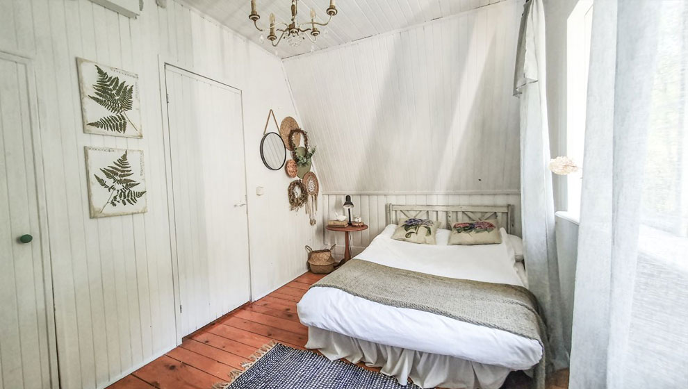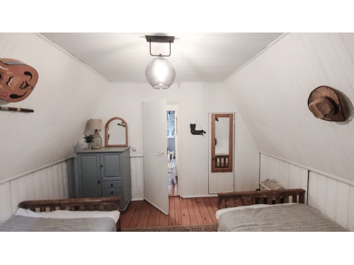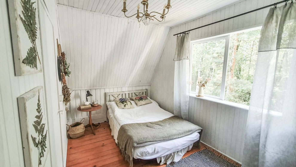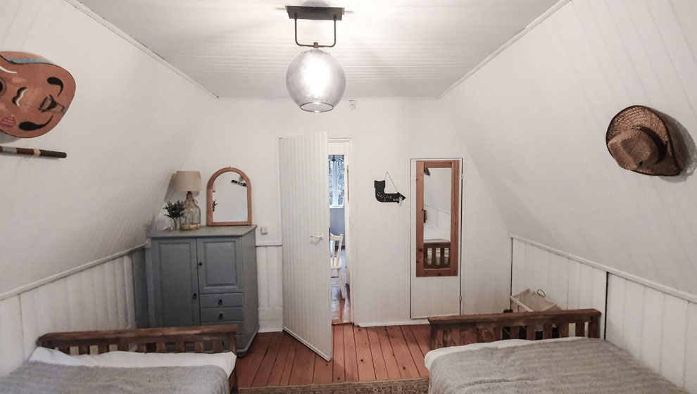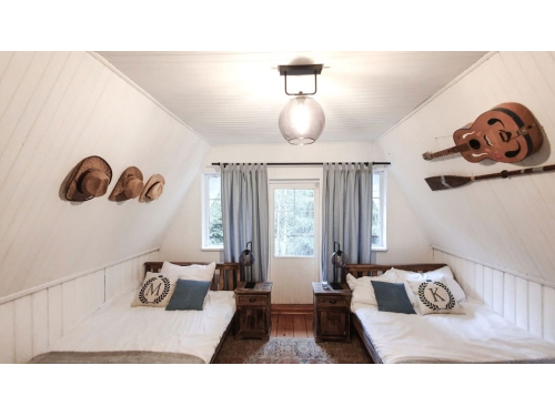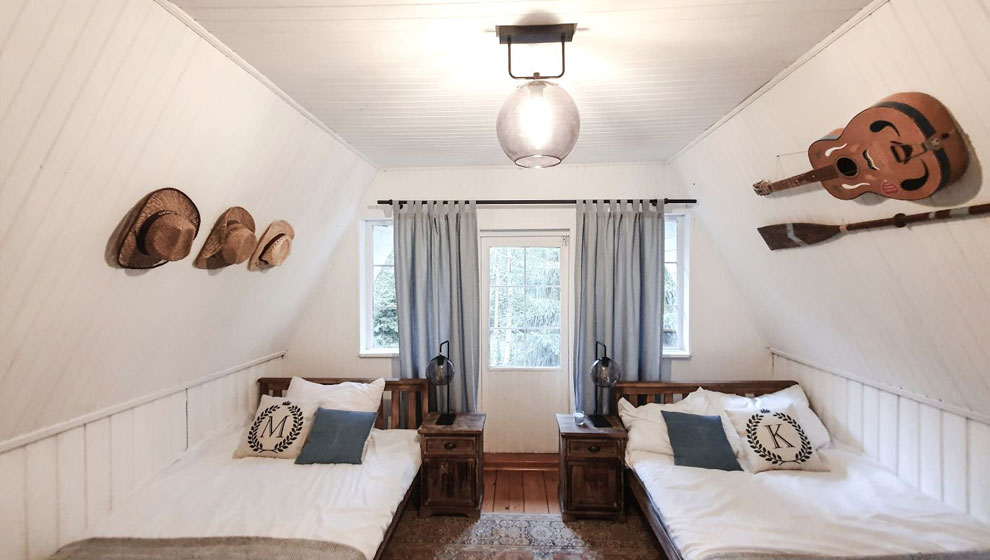 Sypialnia nr 1 - jedno dwuosobowe łóżko małżeńskie z widokiem na las - rozmiar 140x200 Sypialnia nr 2 - dwa dwuosobowe łózka z widokiem na las - rozmiar łóżek taki sam 140x200